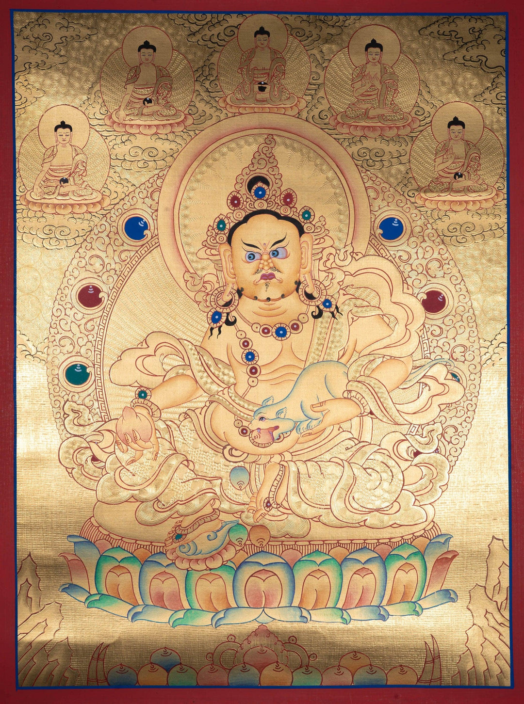 In Tibet, Vaiśravaṇa becomes Jambhala often spelled Zambala, one of the most recognizable wealth deities in Thangka art. In Tibetan Thangka paintings, Jambhala sits powerfully upon a Snow Lion, holding a mongoose that pours forth jewels. His expression is fierce, not indulgent. The message is clear: wealth must be protected and directed toward higher purpose. Jambhala rituals are performed not for extravagance, but to remove poverty and generate merit for spiritual growth.